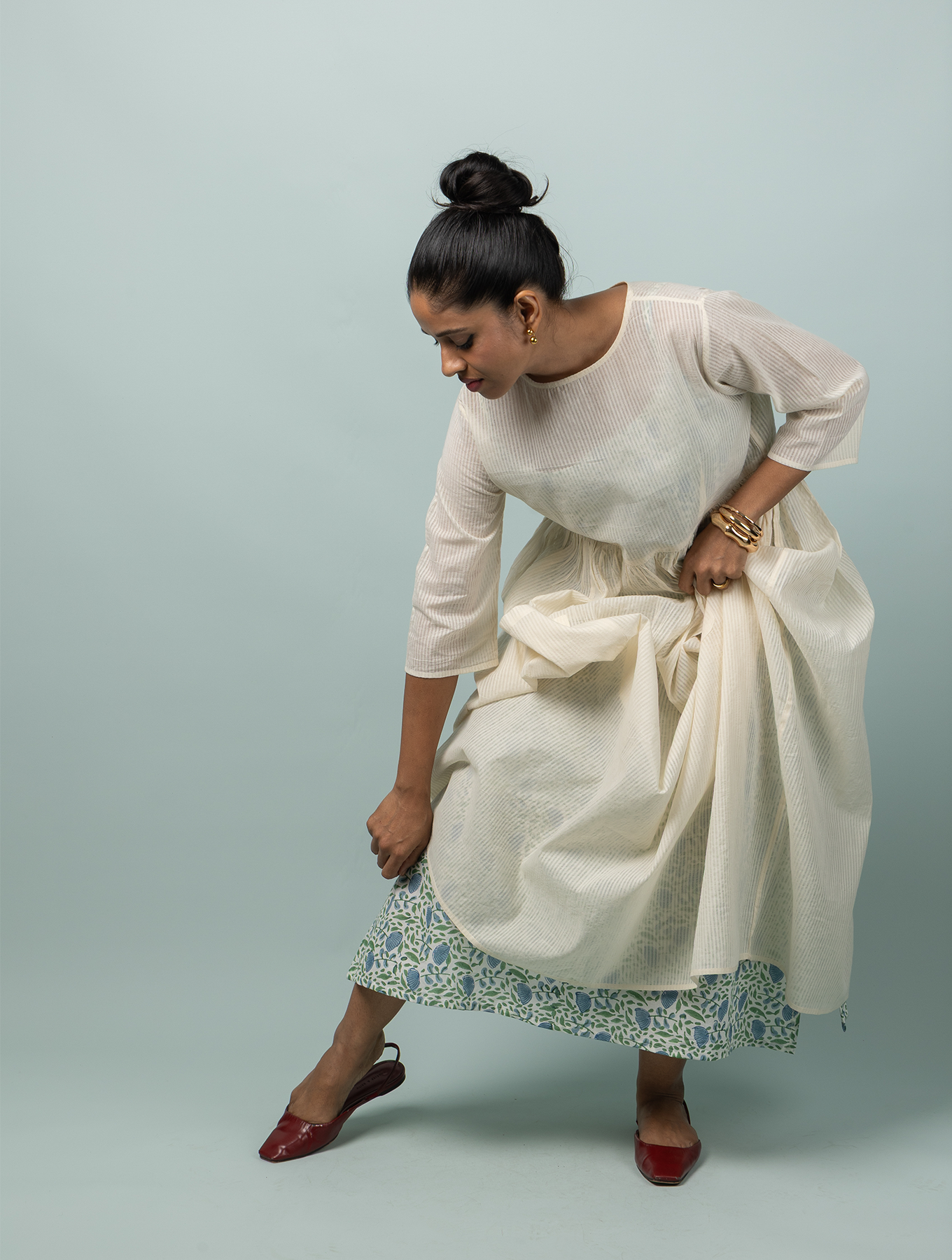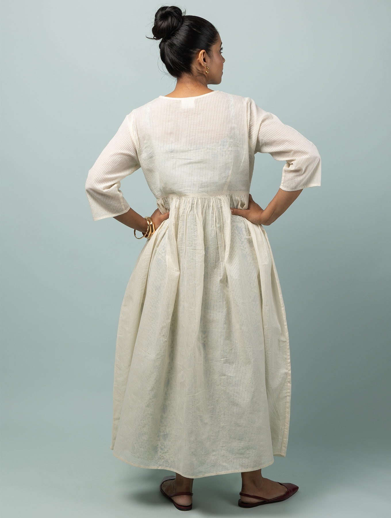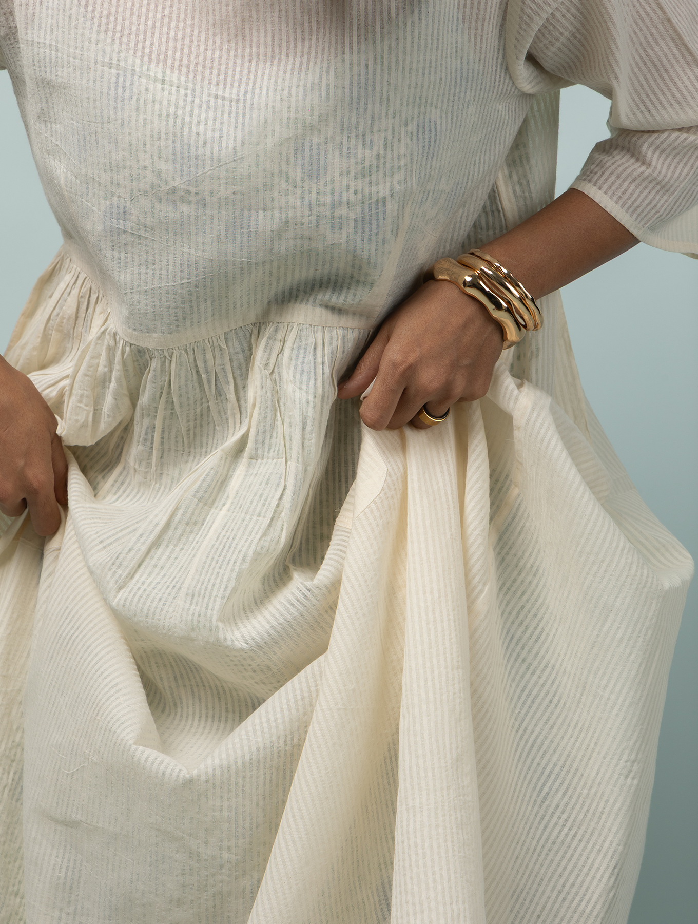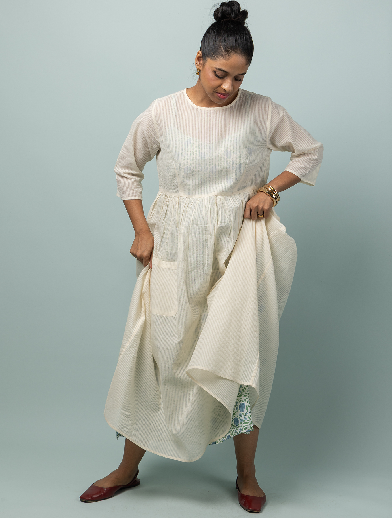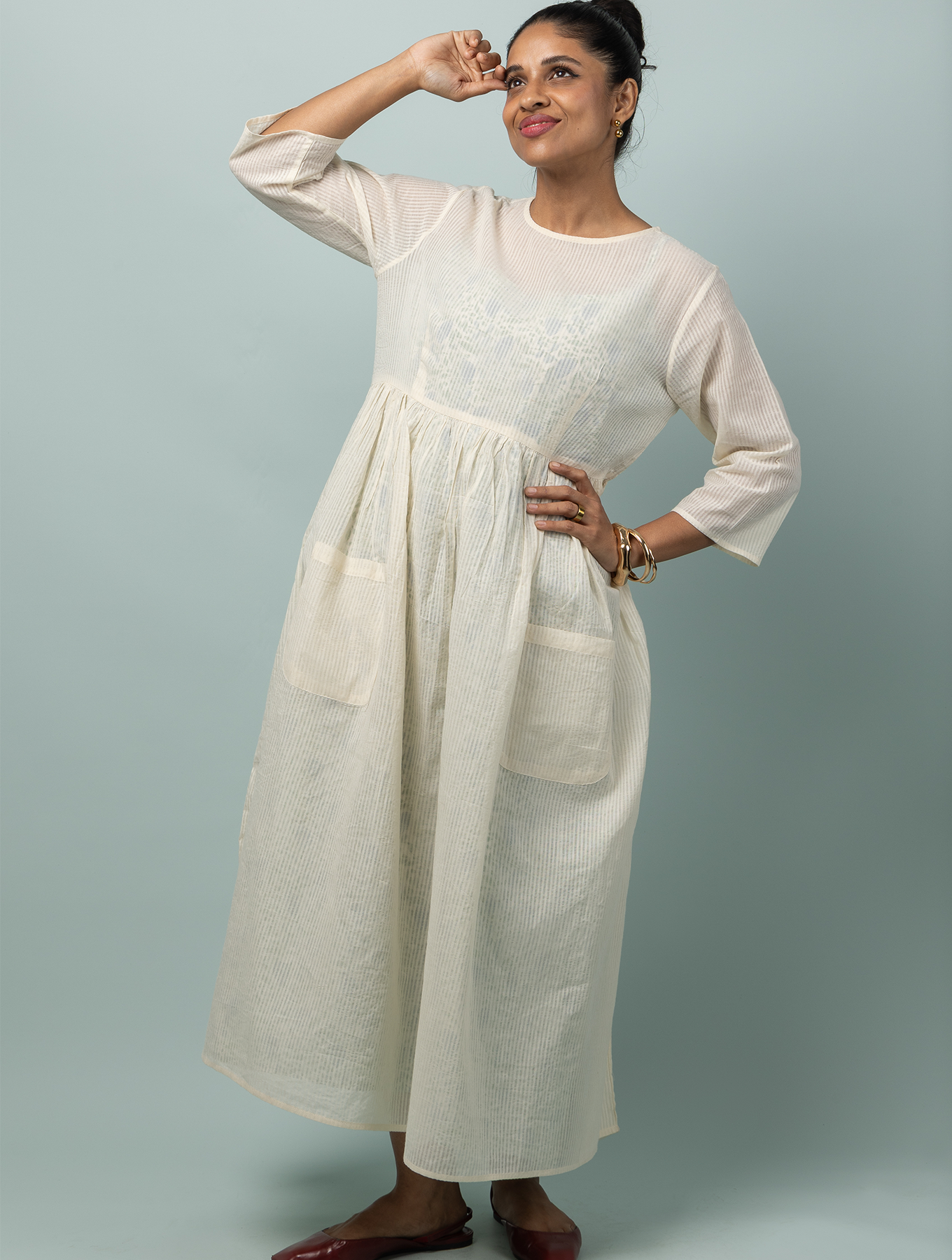 A summer dress made of the lightest cotton, with charming front pockets and the barest minimum pleats to give you a gathered silhouette. Designed for indulgent summer picnics spent with friends, this is a lovely rendition of the perfect summer day- warm, simple and unpretentious. The camisole dress worn as an inner as shown here is sold separately.