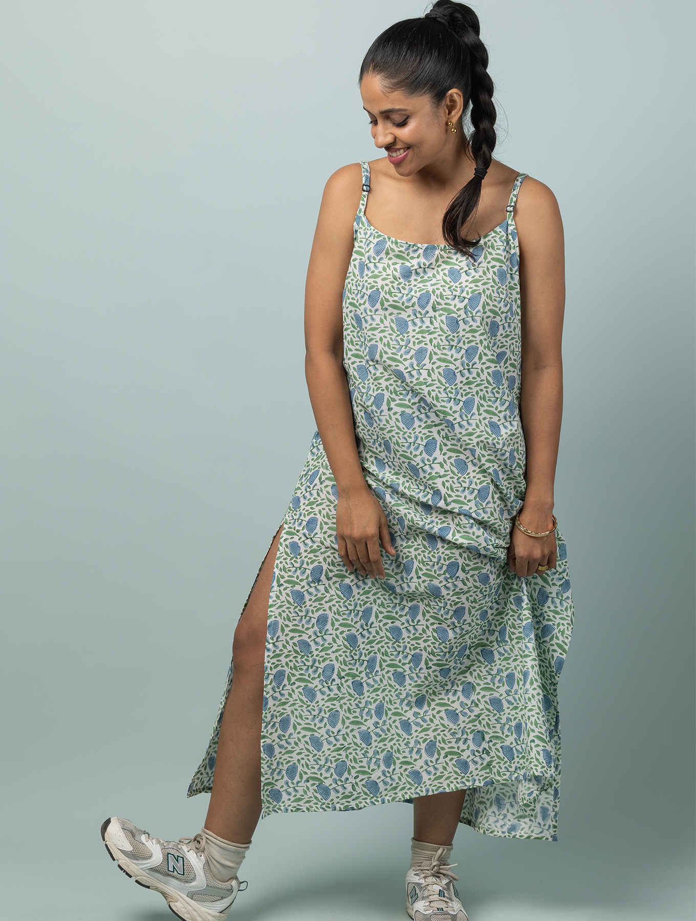 A summer camisole dress made of light blockprinted cotton in our Ballad Blue print. The dress has high slits on either side allowing for easy movement. You can wear it on its own, or style it as an inner slip with a transparent dress.